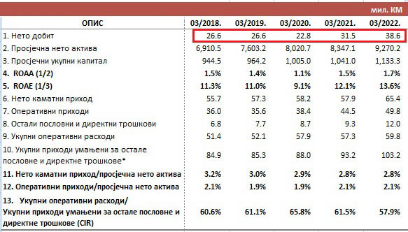 Banke iz RS su u zadnjih pet godina u prva tri mjeseca 2022. imale i najveću prosječnu neto aktivu u iznosu od 9 milijardi i 270,2 miliona KM, koja je na primjer u odnosu na isti period lani (8 milijardi i 347,1 milion KM) bila veća oko 11,1 posto. U odnosu na prvi kvartal 2020. prosječna neto aktiva na kraju marta 2022. porasla je za 15,6%, u odnosu na prvi kvartal 2019. veća je za 21,9%, a u odnosu na prvi kvartal 2018. veća je za 34,1%.