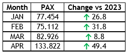 Prvi mjesec ljetne sezone 2024. počeo je snažno za Međunarodni aerodrom Sarajevo jer je na svom terminalu primio 133.822 putnika, što predstavlja povećanje od 49,4% u odnosu na april prošle godine, kao i poboljšanje od 41,3% u odnosu na prethodni najbolji april 2022. godine.