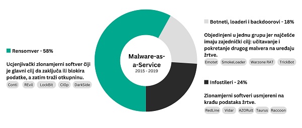 Infostealers – kradljivci podataka su činili 24% MaaS porodica u periodu obuhvaćenom studijom. Infostileri su napravljeni tako da kradu ovlaštenja, lozinke, bankarske kartice i račune, istoriju pretrage, podatke kripto novčanika i brojne druge podatke koje ostvaljamo online.