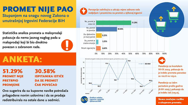 Stupanje na snagu novog Zakona o unutrašnjoj trgovini FBiH, čiji član 18. regulira zabranu rada nedjeljom i praznicima nije imao negativan utjecaj na sektor trgovine u Federaciji BiH. Pokazala je to ‘Analiza uticaja mjere zabrane rada nedjeljom i praznicima na sektor trgovine u FBiH’ autorice Elme Demir, koju je danas predstavio Sindikat radnika trgovine BiH (STBIH).