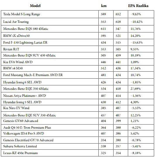 Svake godine svjedoci smo brojnih testova dometa električnih vozila, a sada je American Consumer Reports uradio još jedan – ali na autocesti. Testirana su 22 električna automobila pri brzini od 112 km/h sve dok nisu stala zbog manjka struje. Treba znati da je test proveden na ljetnim temperaturama te da je zimi domet znatno kraći. Automobili su zatim uspoređeni sa službenom brojkom EPA-e, što je američka inačica WLTP-a. Ispostavilo da je nekoliko automobila vozilo više nego što EPA najavljuje, dok su neki prešli manje kilometara.