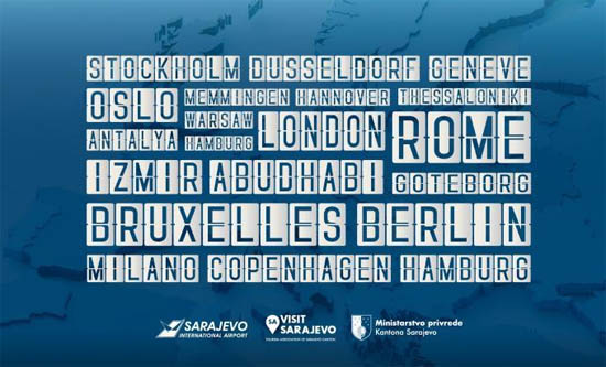 Na današnjoj press konferenciji održanoj u Kantonu Sarajevo predstavljene su nove destinacije s kojima će Sarajevo biti direktno povezano avionskim linijama, čime se nastoji dodatno ojačati turistički i privredni potencijal ovog kantona. Sarajevo će u naredne dvije godine biti povezano sa Berlinom, Hanoverom, Genevom, Dusseldorfom i Hamburgom, kao i s već postojećim destinacijama, a to su: Copenhagen, Oslo, Stockholm, Memmingenu, Warsaw, Gothenburg, London, Brisel, Milano, Roma, Abu Dhabi, Thesasaloniki, Antalya, Izmir, te sa pet novih destinacija aviokompanije Ryanair, od kojih je jedna Stockholm koja je nedavno objavljena.