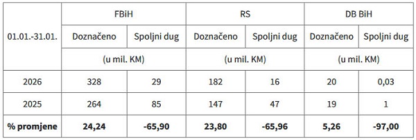 U tablici ispod dat je prikaz ukupno raspoređenih sredstava entitetima i Brčko distriktu BiH sa pripadajućim spoljnim dugom u januaru 2026. u poređenju sa istim periodom prošle godine. Svi iznosi su iskazani u milionima KM.