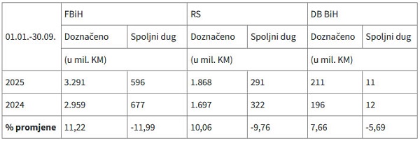 U tablici ispod dat je prikaz ukupno raspoređenih sredstava entitetima i Brčko distriktu BiH sa pripadajućim spoljnim dugom u devet mjeseci 2025. u poređenju sa istim periodom prošle godine. Svi iznosi su iskazani u milionima KM.