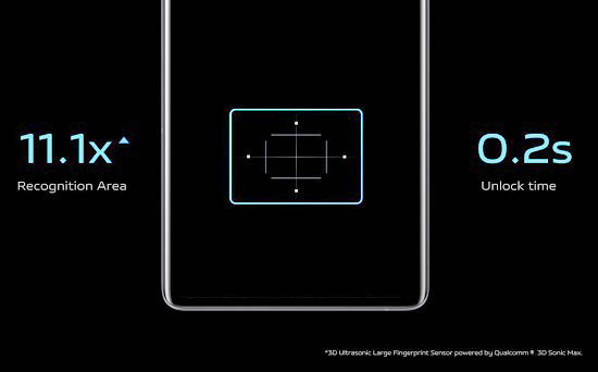 Smješten ispod ekrana, ovaj senzor otiska prsta površine 20×30 mm2 najveći je u industriji pametnih telefona. Površina za čitanje je 11,1 puta veća od tradicionalnih optičkih senzora otiska prsta na ekranu, što poboljšava cjelokupno iskustvo otključavanja.